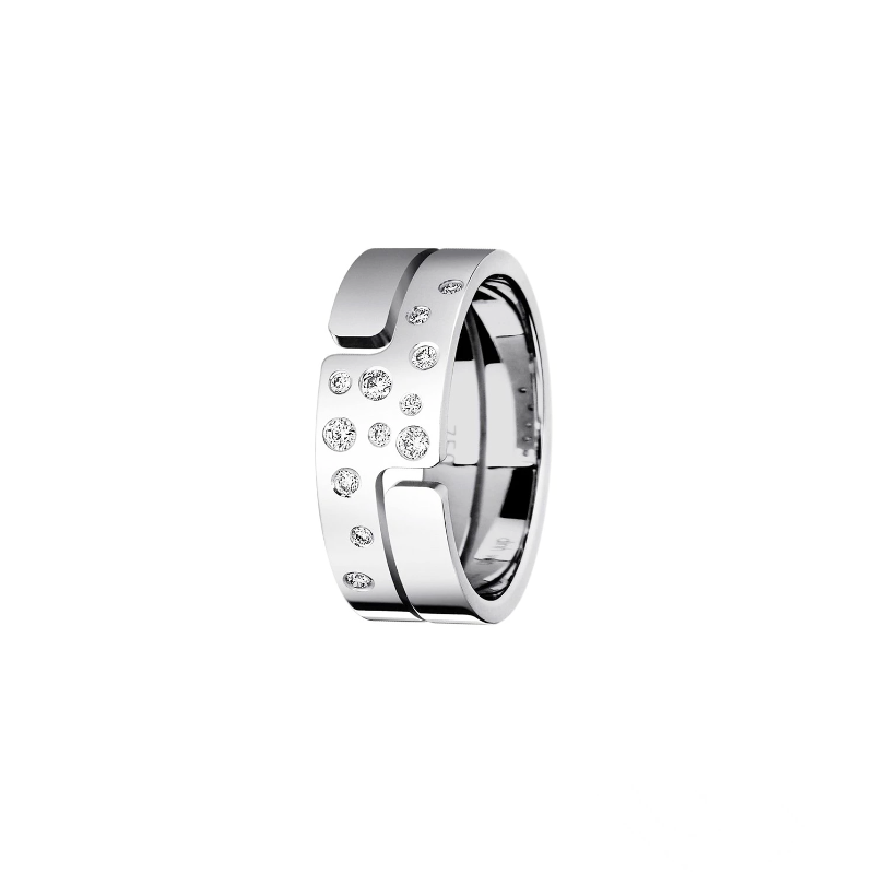 Bague Seventies en or blanc 18 carats. Cette bague tubulaire semi-pavée allie parfaitement un design d’inspiration vintage et l’épure d’une création contemporaine.