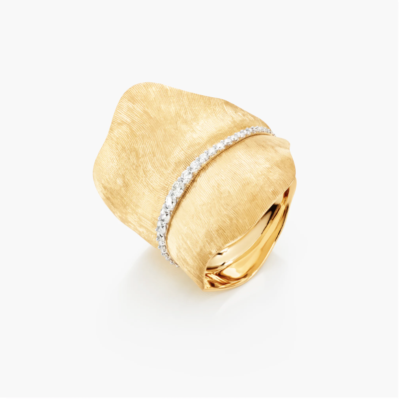Imaginée par Charlotte Lynggaard, la bague Leaves est réalisée en or 18 carats serti de 48 diamants. Utilisant plusieurs techniques et outils différents, les maîtres orfèvres sculptent les surfaces de la bague à la main. Fait partie de la Collection Leaves.