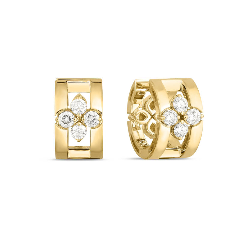 Les diamants décorent ces jolies boucles d’oreilles de Roberto Coin en or jaune 18 carats, qui présentent l’originalité d’un bijou fait à la main.