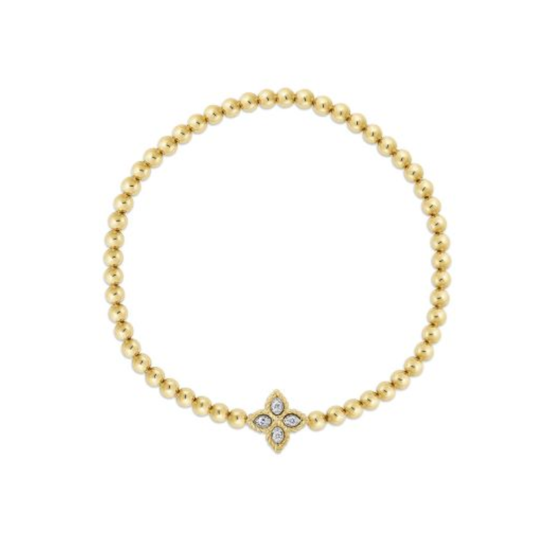 La collection de bijoux Roberto Coin Princess Flower s’inspire de la quintessence du symbole de beauté qu’est la fleur. Chaque bijou Roberto Coin est serti d’un petit rubis à l’intérieur de chaque motif. Le bracelet en or et diamants Roberto Coin Princess Flower est une pièce élégante en or jaune 18ct, sertie de diamants et d’un rubis caractéristique.