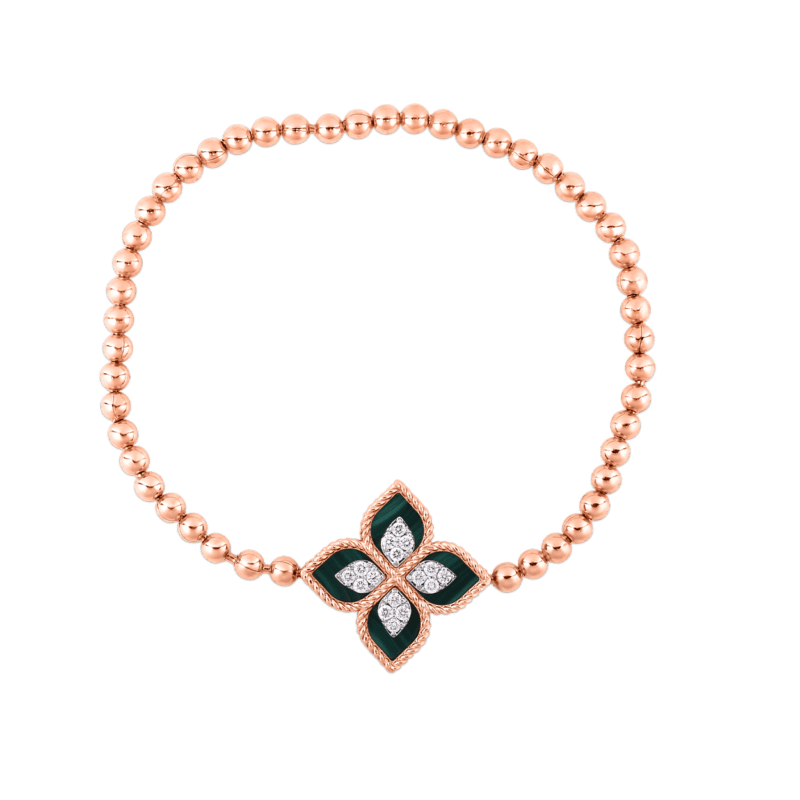 La collection de bijoux Roberto Coin Princess Flower s’inspire de la quintessence du symbole de beauté qu’est la fleur. Chaque bijou Roberto Coin est serti d’un petit rubis à l’intérieur de chaque motif. Le bracelet en or et diamants Roberto Coin Princess Flower est une pièce élégante en or blanc 18ct, sertie de diamants et d’un rubis caractéristique.