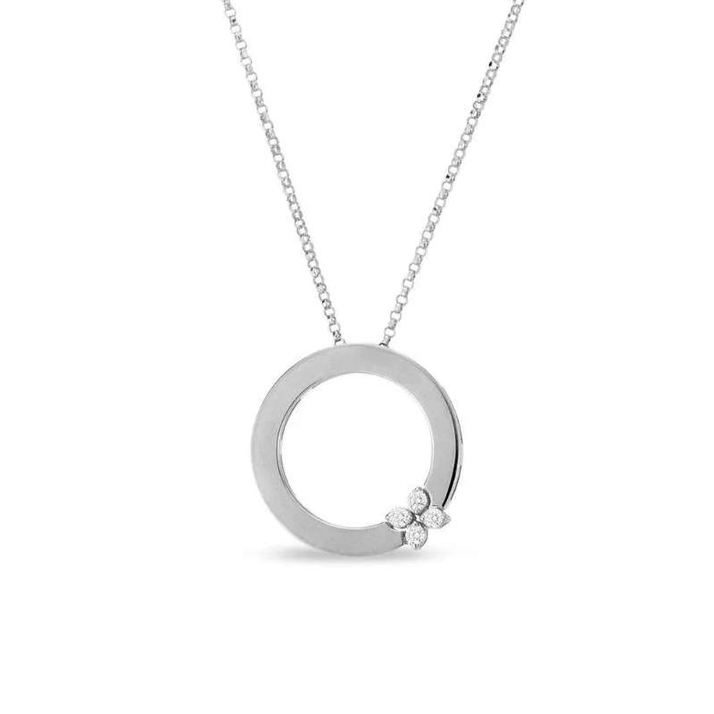 Les diamants illuminent ce pendentif romantique de Roberto Coin, en or blanc 18 carats, et lui confèrent le caractère unique d’un bijou fait à la main.