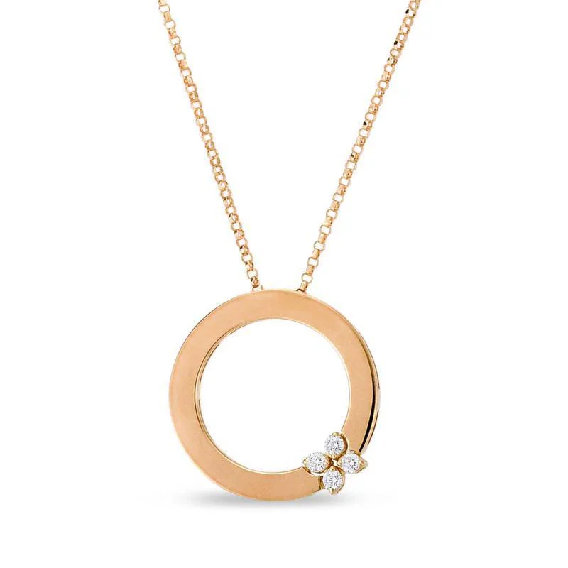 La fleur emblématique à quatre pétales des collections Princesse est répétée sur la surface des pièces Love in Verona. La répétition du motif évoque esthétiquement les Arènes de Vérone, symbole architectural de la ville, et la série d’arcs qui les bordent. Chaque bijou Roberto Coin est serti d’un petit rubis à l’intérieur de chaque motif. Le collier en or et diamants Roberto Coin Love in Verona est une pièce élégante en or rose 18ct avec 0,095cts de diamants et un rubis signature de 0,018ct.