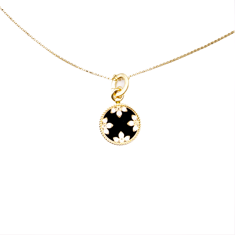 Le jade noir donne de la profondeur à ce collier médaillon à motif floral de Roberto Coin en or jaune 18 carats, avec des diamants et le caractère unique d’un bijou fait à la main.