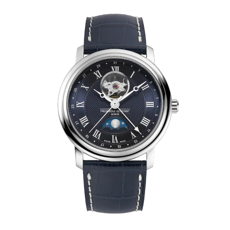 Équipé du mouvement automatique FC-335 Heart Beat, le modèle Classics Heart Beat Moonphase Date affiche un cadran au décor élaboré : un ornement guilloché clous de Paris classique mis en valeur par des index à chiffres romains traditionnels. L’ouverture emblématique à midi, typique des montres Heart Beat, révèle l’échappement en mouvement constant. Cette montre affiche les heures, les minutes, les secondes, la phase lunaire et un indicateur de date.