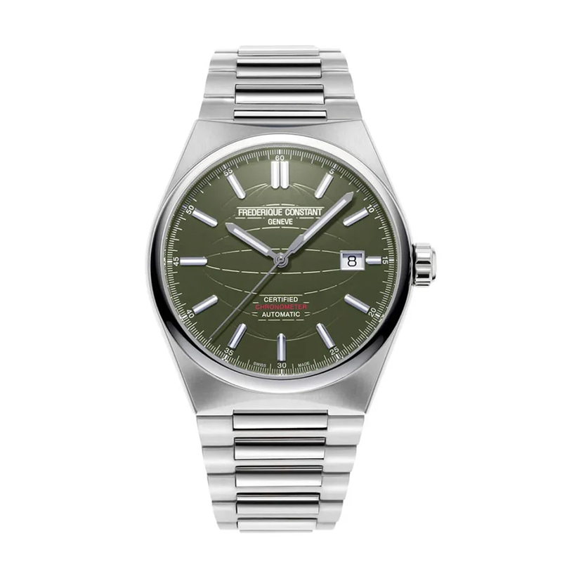 FREDERIQUE CONSTANT HIGHLIFE mouvement automatique, boitier 39 mm en acier, cadran vert, sur bracelet acier + bracelet caoutchouc