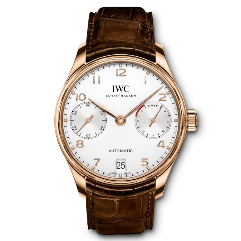 IWC 5007 Portuguese 7 Day IW500701, or rouge 18k sur bracelet avec boucle déployante en or rouge 18k, mouvement automatique calibre IWC 51011, cadran argenté avec index chiffres arabes appliqués en or rouge, date à 6h, petite seconde, réserve de marche de 7 jours avec indicateur à 3h, glace saphir, fond transparent, étanche, Diamètre : 42.3 mm, Epaisseur : 14mm.