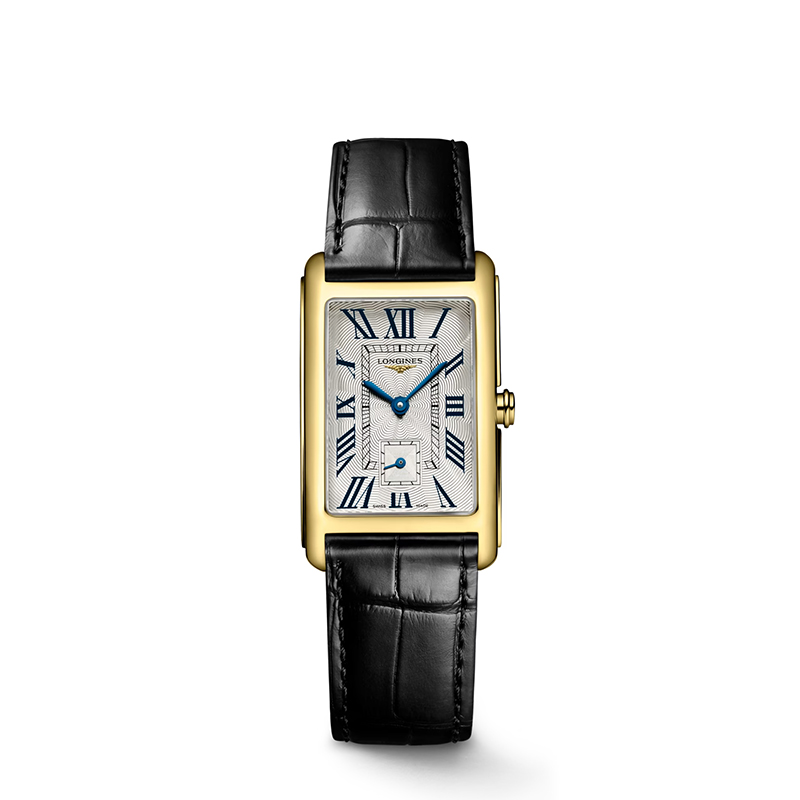 LONGINES DOLCE VITA mouvement à quartz, boitier 23 x 37 mm en or jaune, cadran argenté, p etite seconde à 6h, sur bracelet en cuir alligator noir