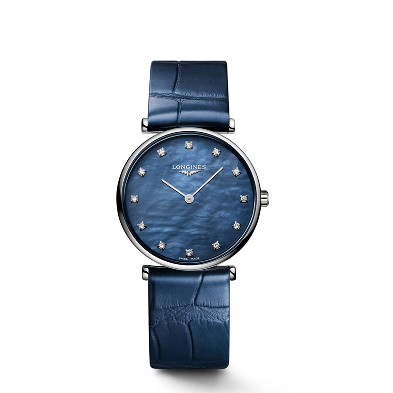 LONGINES LA GRANDE CLASSIQUE « Mother of Pearl », mouvement à quartz, boitier 29 mm en acier, cadran nacre bleu avec 12 index sertis de brillants d’un poids total de : 0,081cts.VS-SI TW sur bracelet en cuir bleu