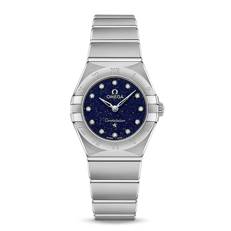 Ce modèle en acier inoxydable de 25 mm arbore une lunette gravée de chiffres romains, un cadran en verre d’aventurine bleu et des index sertis de diamants. Les aiguilles, le logo OMEGA, l’étoile Constellation et les chatons des diamants sont façonnés en or blanc 18K.