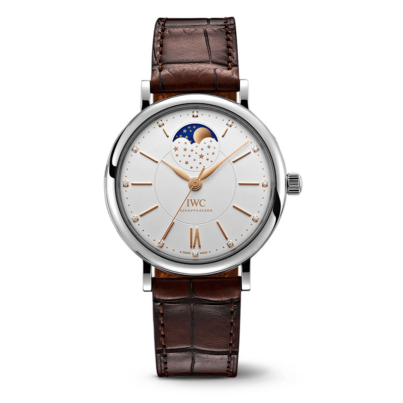 IWC crée la collection Portofino en 1984. Elle doit son nom au village idyllique éponyme de la côte italienne, destination de vacances exclusive de la jet-set internationale dans les années 1950 et 1960. Depuis, les montres Portofino insufflent à la décontraction méditerranéenne une certaine touche de glamour et d’élégance. La Portofino Automatic Phase de Lune est la première montre Portofino à posséder un boîtier de 40 mm de diamètre affichant les phases de lune. Jusqu’à ce jour, cette complication populaire n’était disponible que sur les modèles de 45 mm ou de 37 mm. Cette montre possède un boîtier en acier fin classique. Scintillant au milieu d’un ciel bleu nuit, sa lune d’or renforce par ailleurs le contraste magnifique que son cadran argenté forme avec ses appliques et ses aiguilles plaquées or. Cette montre d’une élégance décontractée est accompagnée d’un bracelet en alligator brun peint à la main.