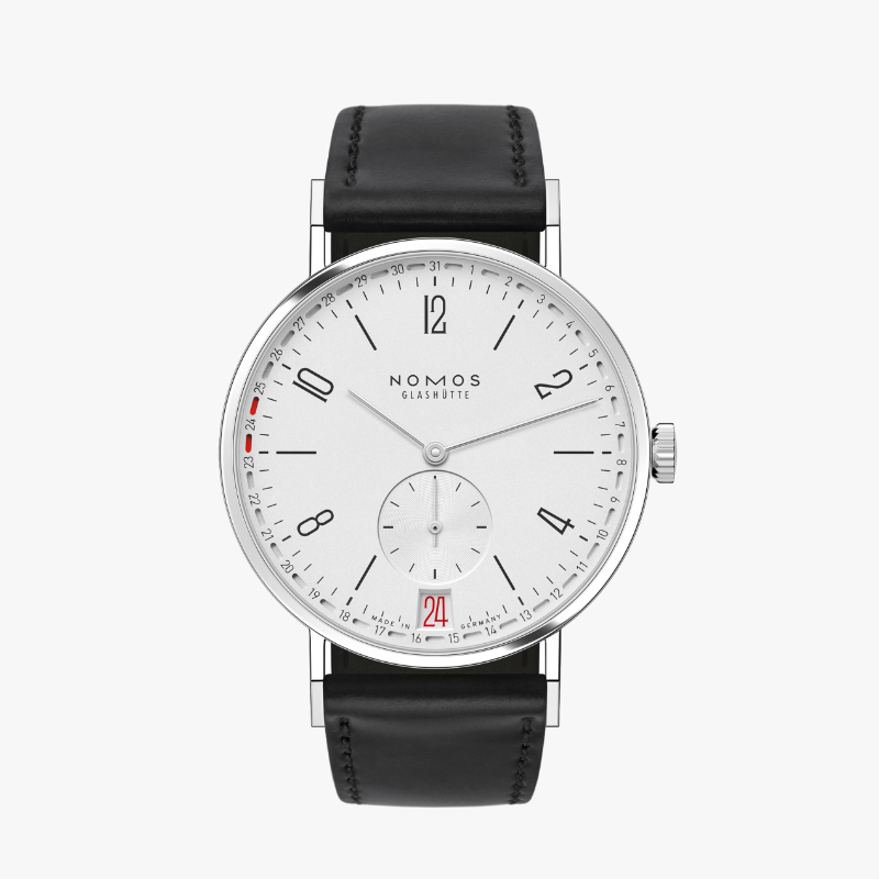 L’amour au deuxième coup d’œil aussi : cette Tangente de 37,5 mm de diamètre propose deux indicateurs de date en rouge qui se complètent harmonieusement. L’anneau de date, exclusivité NOMOS disponible pour la première fois dans une montre à remontage manuel, indique le mois entier ; pendant ce temps, le grand guichet de date à 6 h se concentre sur la date actuelle. À minuit ou quand la fonction de réglage rapide est activée, les deux indicateurs impriment au cadran plaqué argent blanc à aiguilles plaquées rhodium un mouvement sublime à deux titres.